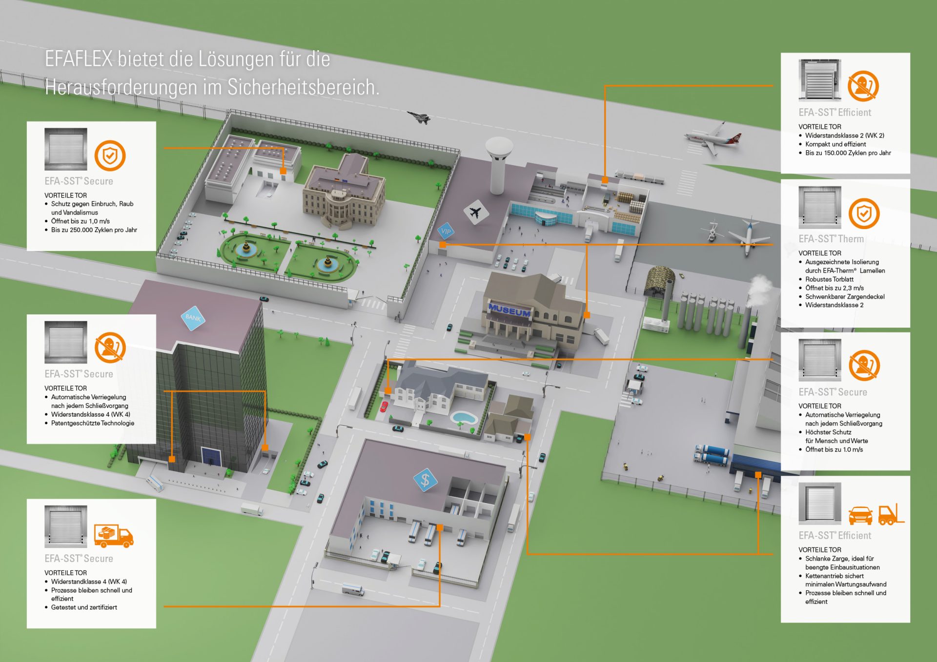Durch Einbrüche in Betrieben, Praxen und Büros entstehen jährlich Schäden in Höhe von mehreren hundert Millionen Euro. Mit Sicherheitslösungen von EFAFLEX schützen Sie sich wirksam gegen Diebstahl und Vandalismus. Unsere Sicherheitstore überzeugen durch ihre robuste Bauweise, höchste Öffnungs- und Schließgeschwindigkeiten und zertifizierten Widerstand: