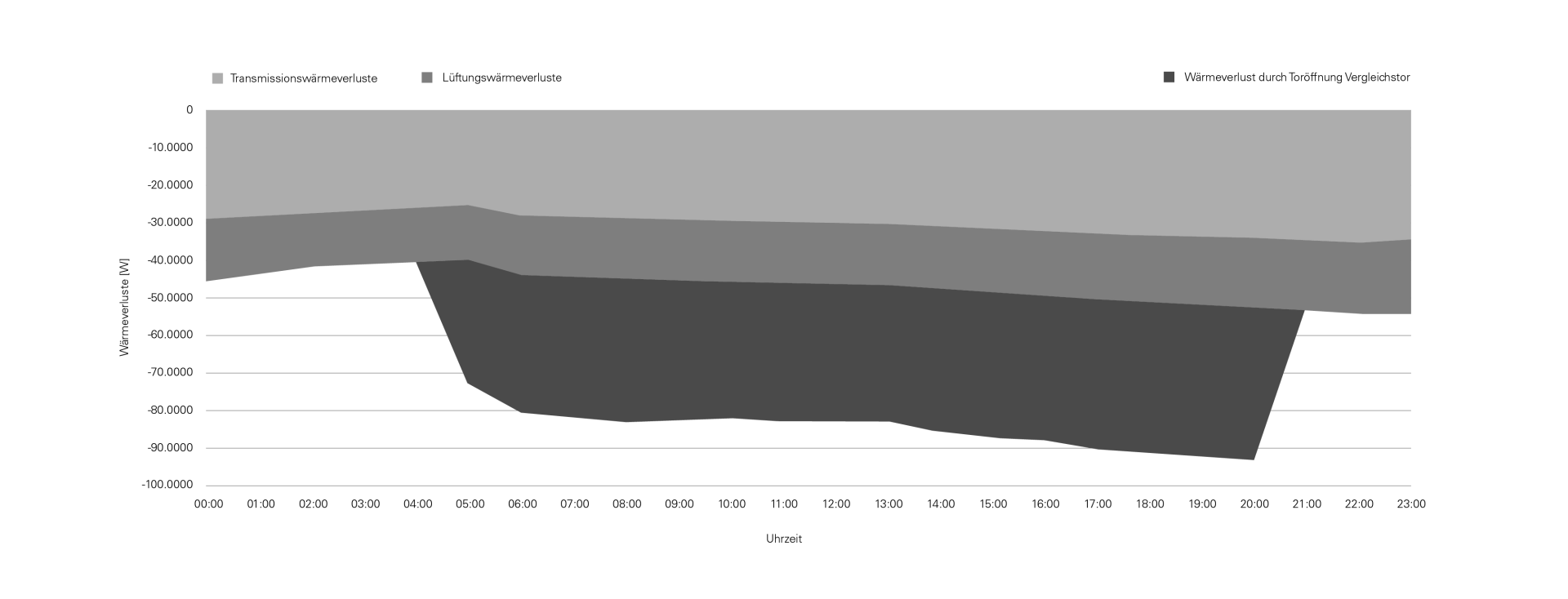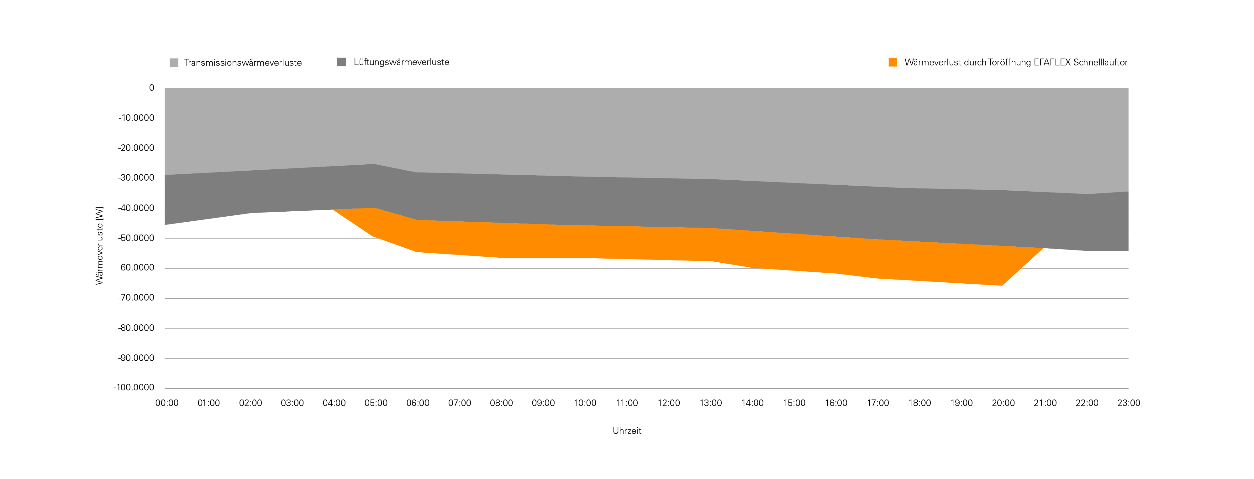 Der schwarz/orange Balken zeigt die Energieverluste eines Industrie-Gebäudes aufgrund von Toröffnungen an einem typischen Arbeitstag. Der Schieberegler simuliert, wie unsere Tore diese Energieverluste über den Tag drastisch senken. Mit unseren schnellen Toren sparen sie nachweisbar Kosten, Strom und Emissionen. (Grafik: Erweiterte Messungen durch unseren Partner Etanomics auf Basis der Studie der TUM)